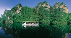 寶峰湖,位于世界自然遺產(chǎn)地武陵源,是張家界精品旅游線路之一。其核心景區(qū)是長(zhǎng)2.5公里、寬200至1000米,平均深72米的寶峰湖,這是目前武陵源世界自然遺產(chǎn)唯一以水為主的旅游景點(diǎn)。寶峰湖地處高山之間,接納自然水流,絕無人為污染,因而水質(zhì)清冽,為人稱道。湖的四周,是數(shù)座綠樹簇?fù)?、形態(tài)各異、刀劈斧削的砂巖石峰。至若蕩舟湖中,則見湖面如鏡,奇峰綠樹盡映湖中,呈現(xiàn)出一幅美妙的上下對(duì)稱的山水畫,意趣無窮。